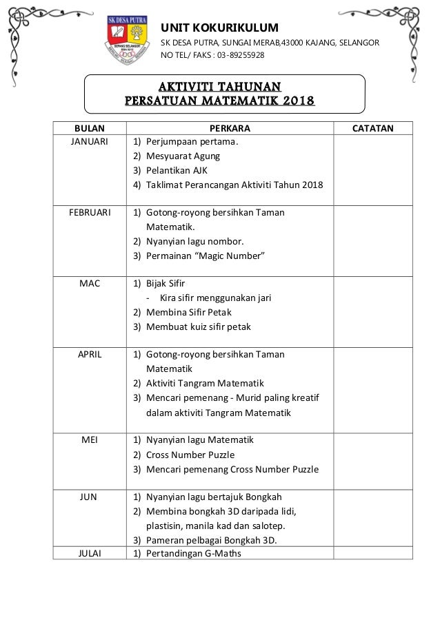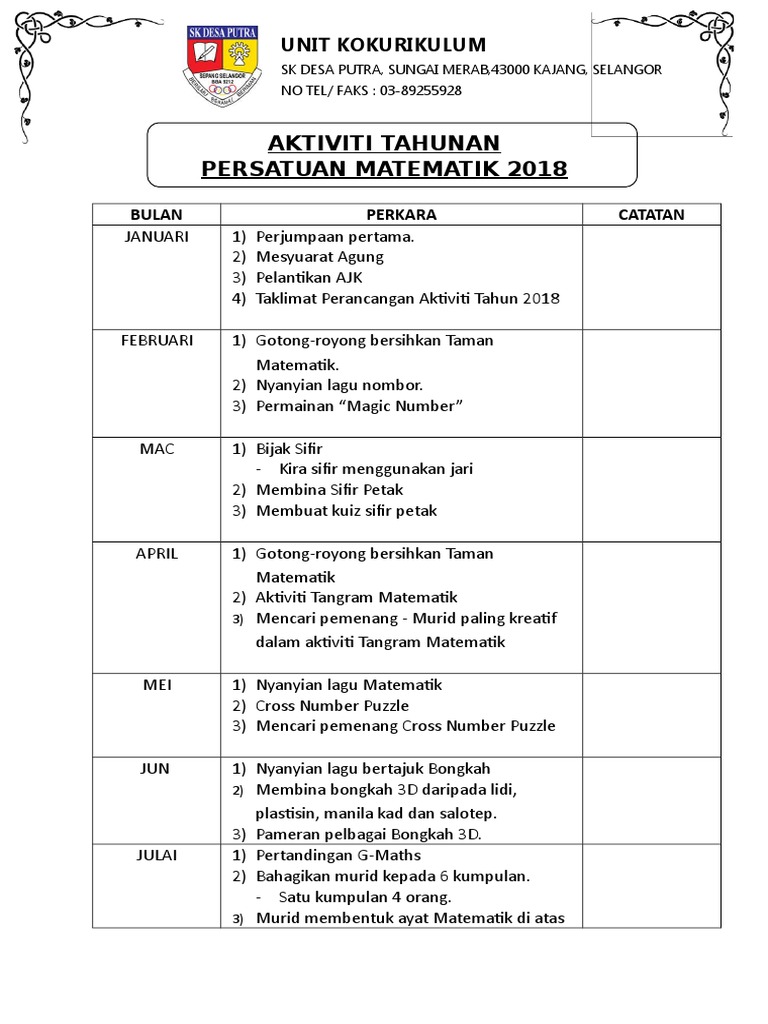 Rancangan Aktiviti Tahunan Persatuan Matematik Pdf